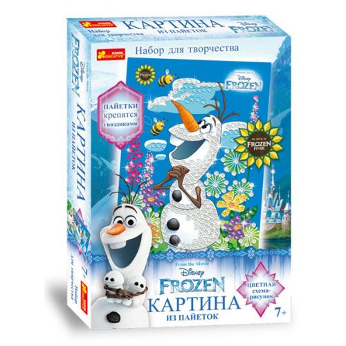 С помощью этого набора для творчества можно создать красивую и яркую картину из пайеток с изображением снеговика Олафа, персонажа м/ф 'Холодное сердце'. Для этого нужно прикрепить разноцветные пайетки на пенопластовую основу, при помощи гвоздиков, которые идут в комплекте, руководствуясь схемой.