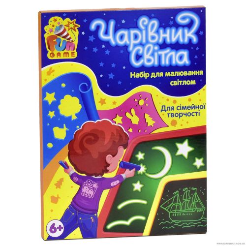 Набор для рисования 'Волшебник Света' (рисуй светом). Необходимо маркёром со включенным фонариком водить на небольшом расстоянии от поверхности доски. Изображение начинают затухать через 5 минут и спустя час исчезает бесследно. Рекомендованное время рисования: 15-20 минут.