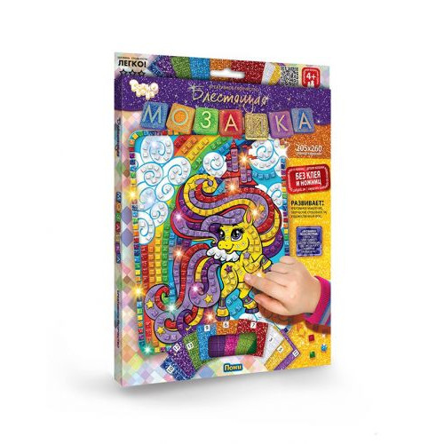 Набор для творчества 'Блестящая мозаика'. Развивает креативное мышление, творческие способности, художественный вкус. Инструкция: 1) Берем картинку и палетку с наклейками; 2) Подбираем палетки с наклейками согласно номерам, указанным на коробке; 3) Отделяем кубики-наклейки от палеток и клеим их на указанные номера картинки; 4) Из оставшихся наклеек оформляем рамку к готовой мозаике. Без клея и ножниц. Размер картинки - 20,5 х 26 см.