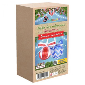 | Комплектация | 2 основы для новогодней игрушки (из пенопласта, 7 см), разноцветные ленточки, клей, двухсторонний скотч, полубусины |