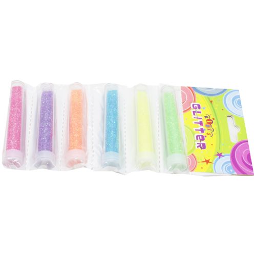 Набор состоит из 6-ти пластиковых колбочек с разноцветной блестящей присыпкой. Глиттер можно использовать в качестве декора при создании различных поделок, украшений, скрапбукинге. Размер одной колбочки: 8х1 см.
