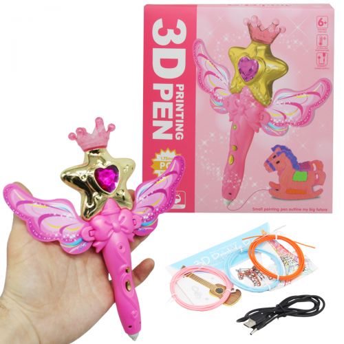 3D-ручка позволяет рисовать объекты в 3D пространстве; создавать фигуры на бумаге (2D), затем, отделяя бумагу от пластика, получать готовую фигуру, либо одну из деталей фигуры; соединять изделия из пластика между собой. 3D ручка имеет удобный и стильный корпус, который отлично помещается даже в руке у ребенка. Выполнена в виде волшебной палочки с короной и крыльями. Керамический носик делает 3D ручку еще более безопасной и практичной. Рисует пластиком АВS и PLA. В наборе есть альбом с разными фигурами и картинками, которые можно использовать как трафареты, 3 цветных нити и зарядное для ручки. Для детей от 6-ти лет.