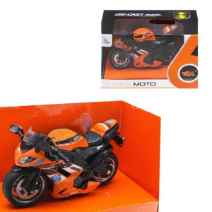 Инерционный мотоцикл. Изготовлен из металлопластика, у колёс - резиновое покрытие. Есть звуковые эффекты, которые активируются нажатием на заднее колесо. Небольшого размера: 12 х 6 см, диаметр колёс: 3,5 см. Выполнен из качественного и безопасного материала.