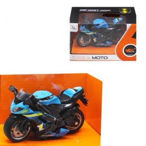 Инерционный мотоцикл. Изготовлен из металлопластика, у колёс - резиновое покрытие. Есть звуковые эффекты, которые активируются нажатием на заднее колесо. Небольшого размера: 12 х 6 см, диаметр колёс: 3,5 см. Выполнен из качественного и безопасного материала.