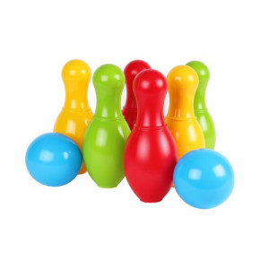 Яркий пластиковый набор для боулинга. В комплекте: 6 кеглей и 2 шара для боулинга. Размер кеглей: 19 см, диаметр шара: 8 см.
