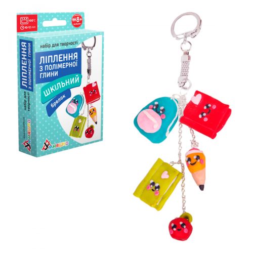 Набор для лепки из полимерной глины. Полимерная глина – это специально созданный материал, который лепится как пластилин, но при этом затвердевает в духовке при очень высоких температурах (100°C на 10-12 минут). Создай яркий брелок для школы своими руками.