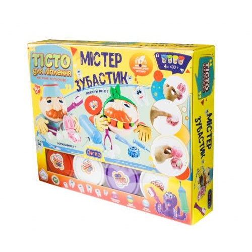 | Комплектация | Пластиковый "Мистер зубастик", пластиковая бормашина, пластиковые, инструменты 6 шт., инструкция, 4 баночки с тестом |