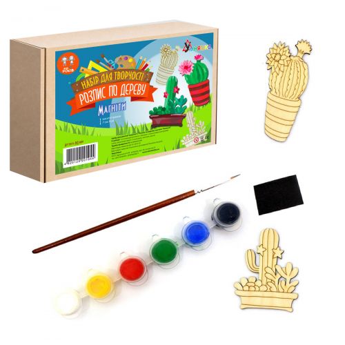 Набор для росписи по дереву 'Магниты'. В комплекте есть все необходимое для создания красивых, оригинальных магнитов: деревянные заготовки - 2 шт., набор акриловых красок - 6 цветов, кисточка, магнит. Выполнено из качественных и безопасных материалов. Для детей от 5 лет.