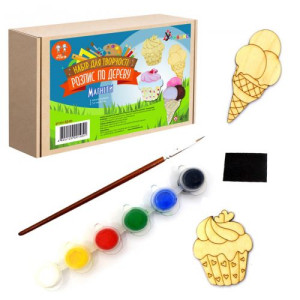 Набор для росписи по дереву 'Магниты'. В комплекте есть все необходимое для создания красивых, оригинальных магнитов: деревянные заготовки - 2 шт., набор акриловых красок - 6 цветов, кисточка, магнит. Выполнено из качественных и безопасных материалов. Для детей от 5 лет.