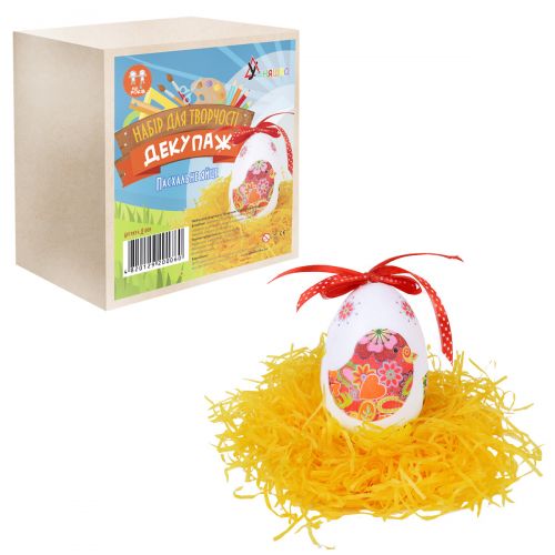 | Комплектация | заготовка из пенопласта-пасхальное яйцо, декупажная салфетка, клей ПВА, акриловая краска, кисть, ленты, наполнитель |