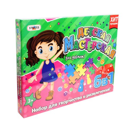 Набор для творчества 'Детская мастерская', для девочек. Большой набор, в который входит целых 6 игр и творческих заданий: картина из пайеток, настольная игра, раскраска, моделирование объемных фигур, браслет, заколка.