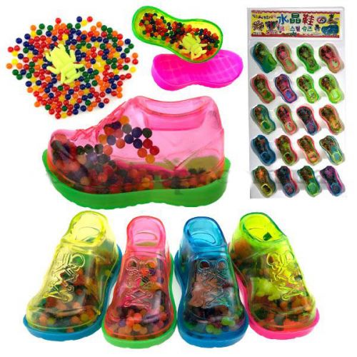 Набор гидрогеля в колбочках в форме башмачка (20 штук). Внутри каждой колбочки находятся шарики гидрогеля, которые при продолжительном контакте с водой увеличиваются в несколько раз и растушка в виде морского обитателя. Чтобы растушка подросла, её нужно положить в ёмкость, наполненную водой (400 г) и подождать примерно 8 часов. Размер одного башмачка: 6 х 3 х 3 см.