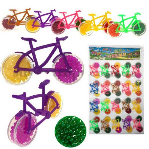Набор гидрогеля в колбочках в форме велосипеда (20 штук). Колёса велосипеда можно крутить. Внутри каждой колбочки находятся шарики гидрогеля, которые при продолжительном контакте с водой увеличиваются в несколько раз. Размер одной штучки: 7,5 х 1,5 х 4,5 см.
