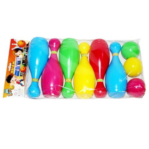 Набор 'Кегли + мячики'. Кегли (6 штук) разного цвета + 3 мячика. Размер кегли - 6,5 х 6,5 х 19 см. Диаметр мячика - 5,5 см.