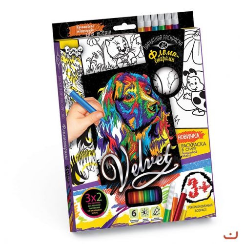 Набор креативного творчества 'Бархатная раскраска фломастерами VELVET '. Сочетание объемного черного бархата и ярких цветов фломастеров, создает неповторимый эффект и развивает художественный вкус. Три рисунка разного размера (14,8 х 21 см, 20,5 х 26 см и 14,8 х 21 см). 6 фломастеров.