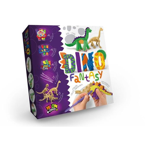 Набор креативного творчества для малыша от пяти лет. Набор включает в себя: три фигурки динозавров, инструкция, пластилин трех видов и инструменты.