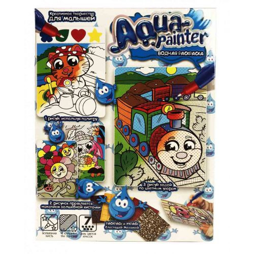 Набор креативного творчества 'Водная раскраска (Aqua painter)'. На картинке с контурами нанесена специальная краска, которая 'активируется' с помощью воды, а 'волшебная кисточка', заправляемая водой не требует специальной емкости и рисует нажатием. После полного высыхания, рисунок можно украсить блестящей мозаикой. 4 картинки, три техники. 7 цветов красок.