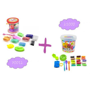 Набор включает в себя две позиции: 1) Набор легкого магического пластилина 'Moon Light Clay', 10 цветов. Предназначено для развития детских творческих способностей к лепке и моделирования. Эта масса обладает удивительными качествами, мягкая, приятная и шелковистая на ощупь и не липнет к рукам. 2 формочки и стек в комплекте. 2) Набор для лепки 'Твои вкусности' (1 л). В наборе: 15 пакетиков с тестом по 20 г, формочки, нож стек, столовые приборы. Развивает мелкую моторику рук.