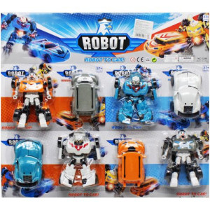 Большой набор ярких роботов, которые легко трансформируются в машинки. В наборе 8 роботов разных цветов, выполненных из прочного пластика. Такие игрушки способствуют развитию воображения и умению исполнять разные роли, а трансформация поможет улучшить мелкую моторику и логическое мышление. Размер робота: 11х9х4 см.