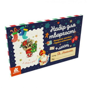 Набор содержит: письмо Святому Николаю, двустороннюю цветную открытку с поздравлением, пошаговую инструкцию, полоски бумаги, цветная бумага, лента, клейкие стразы, глиттер, жгут, клей ПВА.