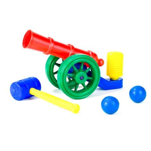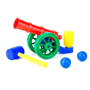 Пушка, стреляет шариками. Зарядив снаряд, и ударив молотом по воздушной помпе, пушка выстрелит шариком (до 5 метров). 2 шарика в комплекте.