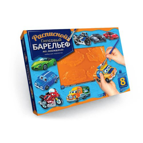 Набор для творчества 'Расписной гипсовый барельеф'. С помощью этого набора можно создать своими руками 8 ярких магнитов в виде различного транспорта. В комплекте есть всё необходимое для этого: прозрачная полимерная форма для отливки (2 шт), гипсовый порошок, комплект из 12 цветов акриловой краски, кисточка, магнитная лента и инструкция.