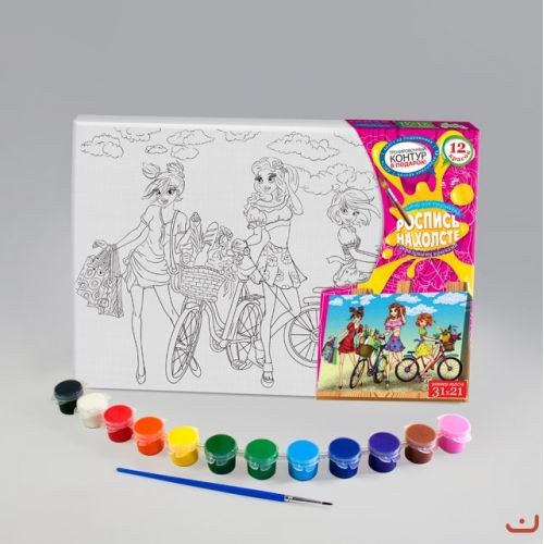 Раскраска на холсте. Уникальный метод раскрашивания 'контурных картин' красками. В наборе, кроме холста, на подрамнике есть еще и бумажный, тренировочный контур. 12 красок и кисточка в комплекте.