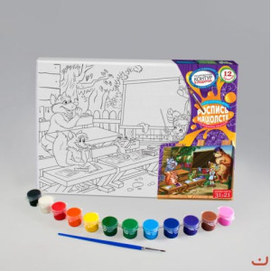 Раскраска на холсте. Уникальный метод раскрашивания 'контурных картин' красками. В наборе, кроме холста, на подрамнике есть еще и бумажный, тренировочный контур. 12 красок и кисточка в комплекте.