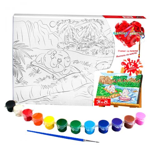 Раскраска на холсте. Уникальный метод раскрашивания 'контурных картин' красками. В наборе, кроме холста, на подрамнике есть еще и бумажный, тренировочный контур. 12 красок и кисточка в комплекте.
