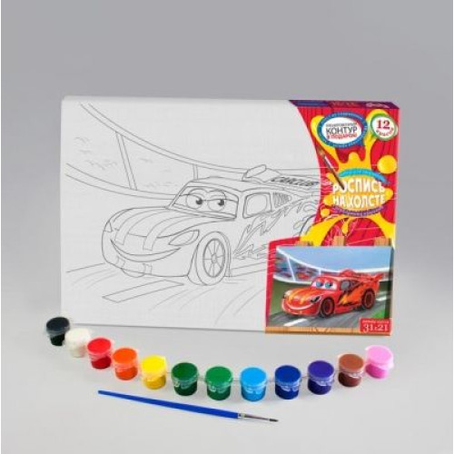 Раскраска на холсте. Уникальный метод раскрашивания 'контурных картин' красками. В наборе, кроме холста, на подрамнике есть еще и бумажный, тренировочный контур. 12 красок и кисточка в комплекте.