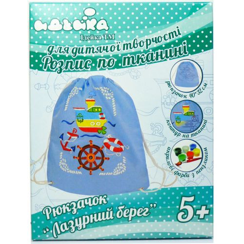 | Комплектация | Рюкзак тканевый с нанесённым контуром рисунка (размер 40*32 см), краски для ткани 6 цветов, кисточка, инструкция |