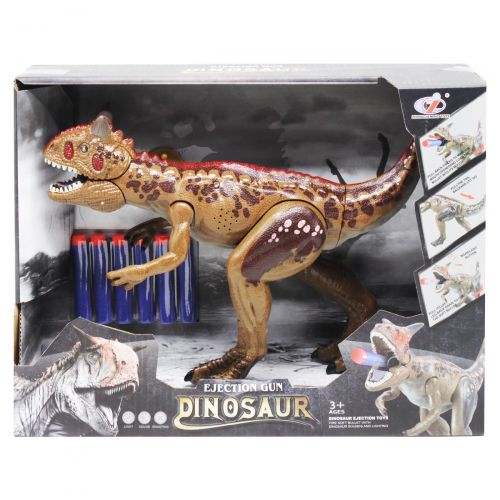 Чтобы динозавр стрелял, нужно вставить параллоновый патрон ему в рот и потянуть за хвост. Динозавр так же умеет рычать, глаза светятся. В наборе есть 6 патронов. Высота игрушки - 20 см.