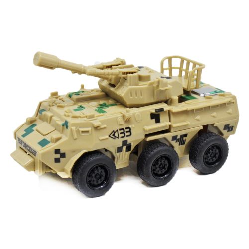 Реалистичная игрушечная модель военной машины. Оснащена резиновыми колесами. Дуло подвижное. Инерционная. Спереди есть кнопка, при нажатии (столкновении) на которую, трансформируется в крутого робота.