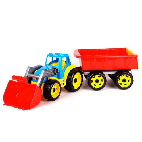 Трактор с ковшом и прицепом. Трактор с ковшом спереди и прицепом сзади. Ковш на тракторе опускается и подымается и имеет несколько фиксированных положений.