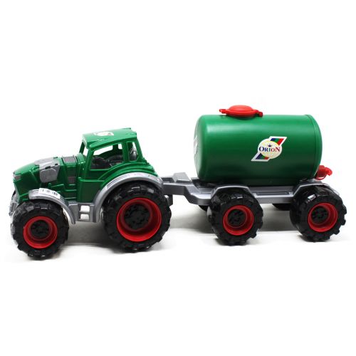Трактор-молоковоз выполнен из крепкого пластика, который подойдет как для игры на асфальте, так и в песочнице. Молоковоз имеет два отверстия для наполнения и слива жидкости, скрепляется с трактором на задней части кузова.
