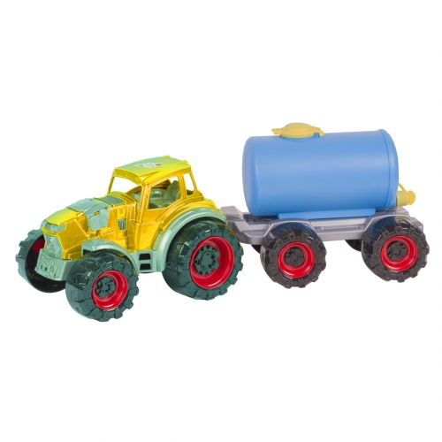 Трактор-молоковоз выполнен из крепкого пластика, который подойдет как для игры на асфальте, так и в песочнице. Молоковоз имеет два отверстия для наполнения и слива жидкости, скрепляется с трактором на задней части кузова.