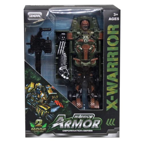 Небольшая игрушка-трансформер 'Warrior Armor'. Может трансформироваться из робота с оружием в военную машинку. Размер игрушки: 16х7х5 см. Выполнен из качественного пластика. Игрушка хорошо детализирована. В комплекте с игрушкой есть оружие для робота. Для детей от 3-х лет.