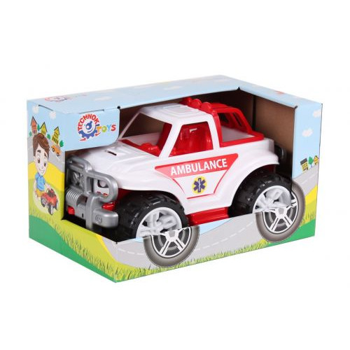 Машинка 'Скорая ТехноК'. Внедорожник с открытым кузовом, массивными бамперами и большими колесами. Оптимальные размеры для использования как в комнате так и для игры на улице.