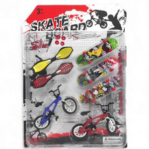 Большой игровой набор миниатюрного транспорта. В комплекте: 5 фингербордов (3+2), два маленьких велосипеда, сменные колеса для скейта и отвертка. Размер фингерборда 9 х 2 см. Прекрасно поможет развивать ребенку ловкость рук и мышления. Различные виды в ассортименте.