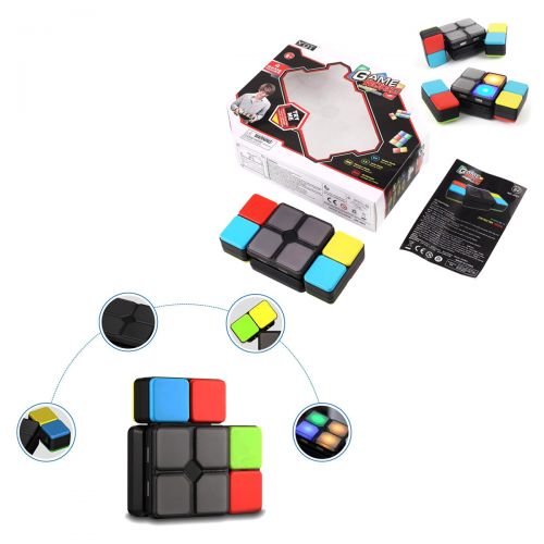 Развивающая головоломка 'Magic Cube'. Игра состоит из 3 сегментов: одного статического и двух подвижных. Цель игры - переместить сегменты так, как показано на центральной панеле. Для включения игрушки нужно перевести тумблер в положение 'on' и нажать на центральную кнопочку на лицевой стороне. 4 режима игры: 1) Speed Mode - собрать цвета на скорость; 2) Level Mode - собрать на время, с каждым уровнем времени дается все меньше и меньше. 3) Memory Mode — на память. Нужно запоминать цвета кубиков и повторять движение. На выполнение дается 8 поворотов. 4) Multyplayer – играют несколько игроков, для каждого свой раунд. На ком кончилось время, тот и проиграл.