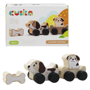 Магнитная игрушка-каталка 'Смышленые щенята'. Состоит из 4-х деревянных элементов: собачка и 'прицеп', который крепится к ней при помощи магнита, а также фигурки в виде щенка и косточки. Фигурки можно легко закрепить на прицепе. Игрушка выполнена из безопасных, экологичных материалов. Длина игрушки - 13 см.