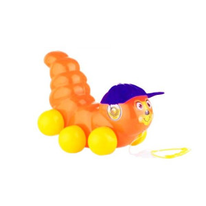 Пластиковая каталка в виде гусеницы с ручкой на верёвочке. При движении - крутятся 'лапки-колёсики'.