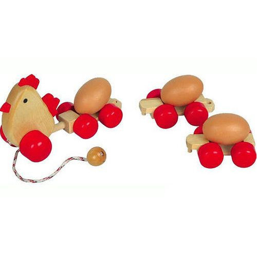 Паровозик 'Курочка', на шнурочке. 3 элемента (складываемые) с яйцами. При движении яйца крутятятся.