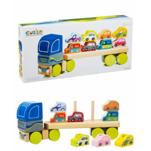 Яркая разноцветная машинка тягач с деревянной основой и колёсами. Поверхность игрушки хорошо отшлифована, не имеет острых краёв. У машинки крутящиеся колёса. Состоит из 12-ти элементов.