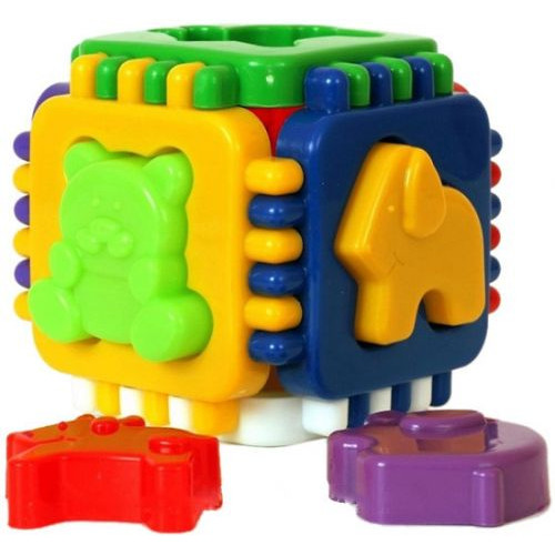 Кубик логический. Сортер в виде складываемого куба. Состоит их 6 емкостей с отверстиями разной формы и размера, а также фигурок-вкладышей в виде животных.