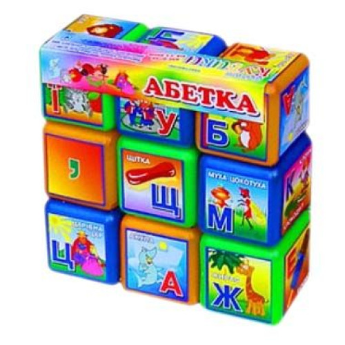 Кубики 'Абетка' (9 штук). Размер кубика - 6 х 6 х 6 см. На каждой из граней изображена одна буква и красочная картинка, значение которой начинается с этой буквы, что помогает быстрее и лучше запоминать буквы.