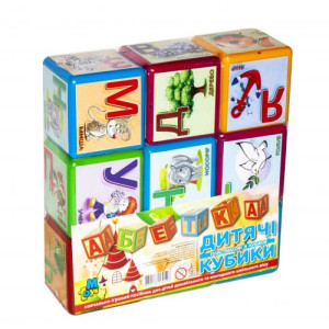 Кубики 'Абетка' (9 штук). Размер кубика - 7 х 7 х 7 см. На каждой из граней изображена одна буква и красочная картинка, значение которой начинается с этой буквы, что помогает быстрее и лучше запоминать буквы.