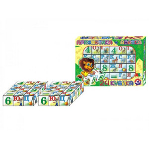 Набор состоит из 24 кубиков с цифрами, буквами украинского алфавита и различными яркими рисунками. На каждой грани кубика находится буква и изображение предмета, который начинается на эту букву, либо же цифра, и соответствующий ей рисунок.
