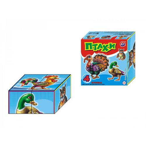 Набор состоит из 4 ярких разноцветных кубиков (4 х 4 см). На каждой грани кубика фрагменты изображения птиц, которые нужно сложить в один рисунок. Развивает логическое мышление, моторику пальцев, фантазию.