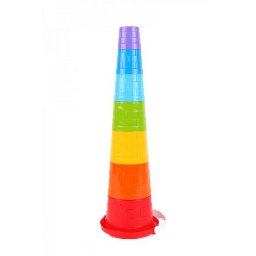 Классическая пирамидка, состоящая из семи элементов. Части пирамидки можно использовать для создания пасочек или песочных замков, так как грани блоков выполнены в стиле средневековых замков. Можно все сложить в удобное ведерко с ручкой.